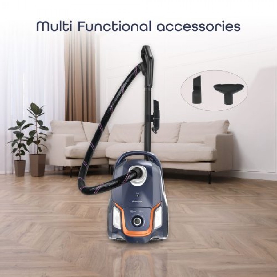 Aspiratorul este dotat cu accesorii utile care fac curățarea mai ușoară și mai eficientă. Duza pentru spații înguste 2 în 1 vă permite să curățați zonele înguste și greu accesibile cu confort și precizie. Duza pentru tapițerie este special concepută pentru curățarea mobilei, perdelelor și a altor suprafețe textile, asigurând o îngrijire profundă și delicată. În plus, baza de depozitare a accesoriilor menține toate accesoriile organizate și întotdeauna la îndemână, astfel încât să aveți întotdeauna ceea ce aveți nevoie.