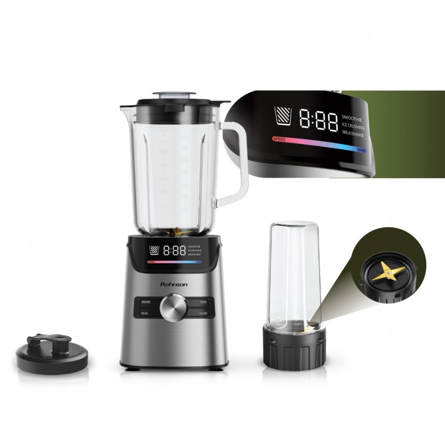 Blender de masa 2 in 1 Rohnson R5348 ,1400W,6 lame acoperite cu titan ,cana mare 1.7L sticla, recipient 600ml cu 4 lame, pulse, panou digital, 3 functii prestabilite
