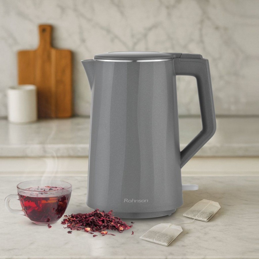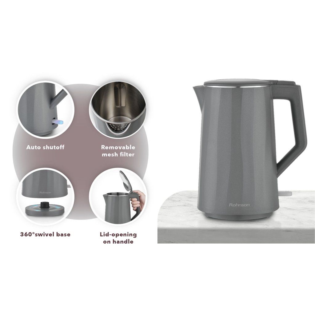 Fierbator electric Rohnson R7536, 1850-2200W, 1.7 l, baza rotativa, filtru anticalcar, protectie anti-fierbere uscata, indicator luminos pornire, oprire automata,gri