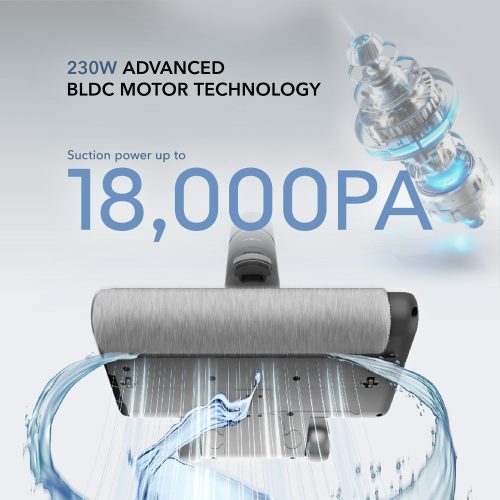 Cu un motor digital avansat (tehnologie BLDC), fără perii, oferă performanțe ridicate, durată lungă de viață și consum redus de energie, comparativ cu motoarele tradiționale. Aspirație extrem de puternică de 18.000 Pa pentru îndepărtarea eficientă chiar și a celor mai mici și fine particule de praf. Garantează o curățare eficientă în fiecare colț al casei, indiferent de tipul de podea.
